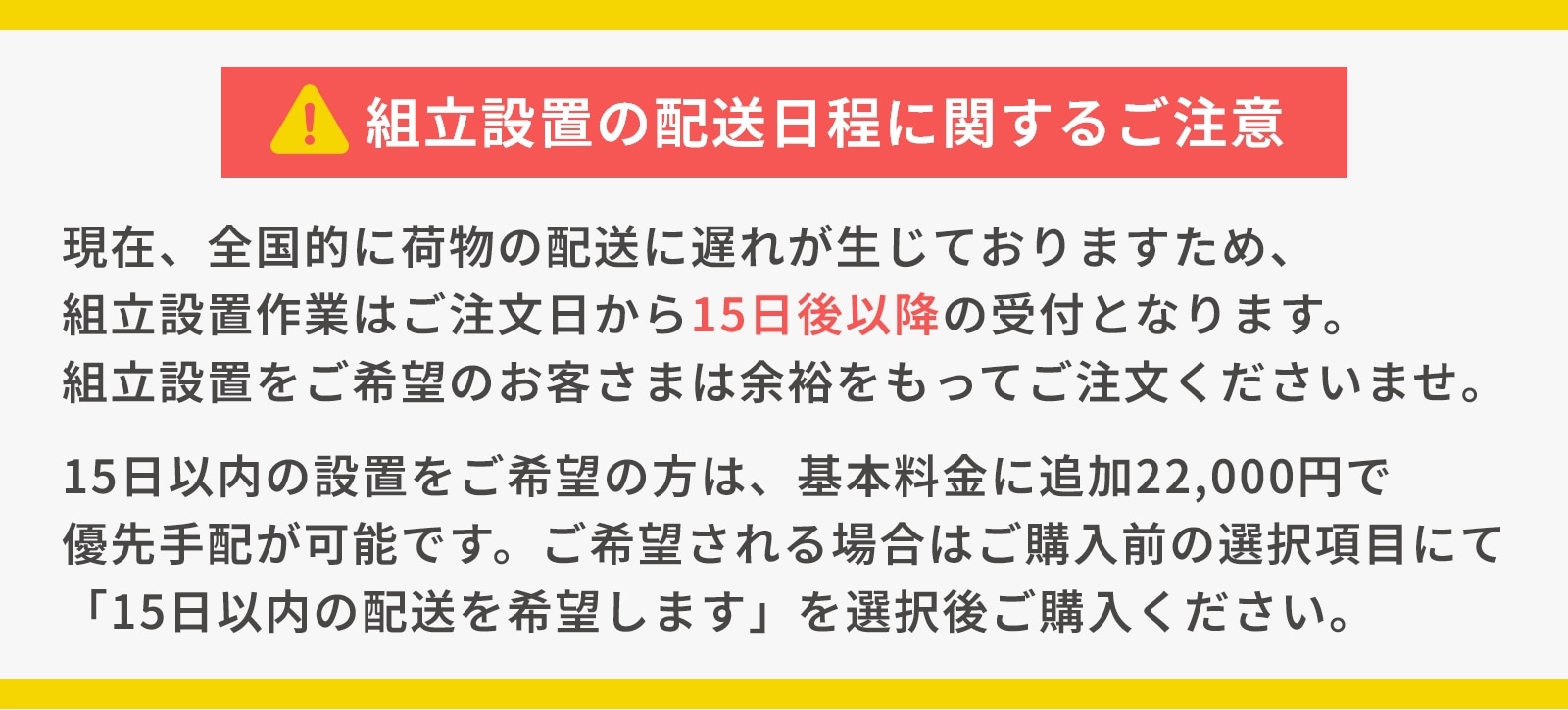 | 組立設置について | こちらの商品は玄関渡しが基本となります。 搬入組立設置をご希望される際は、別途お見積りとなります。 ※現在、組立設置業務を一時休止とさせて頂いております。 なお、組立設置業務の再開は未定となっております。 ご不便をおかけいたしまして、誠に申し訳ございませんが、何卒ご了承の程お願い申し上げます。 |